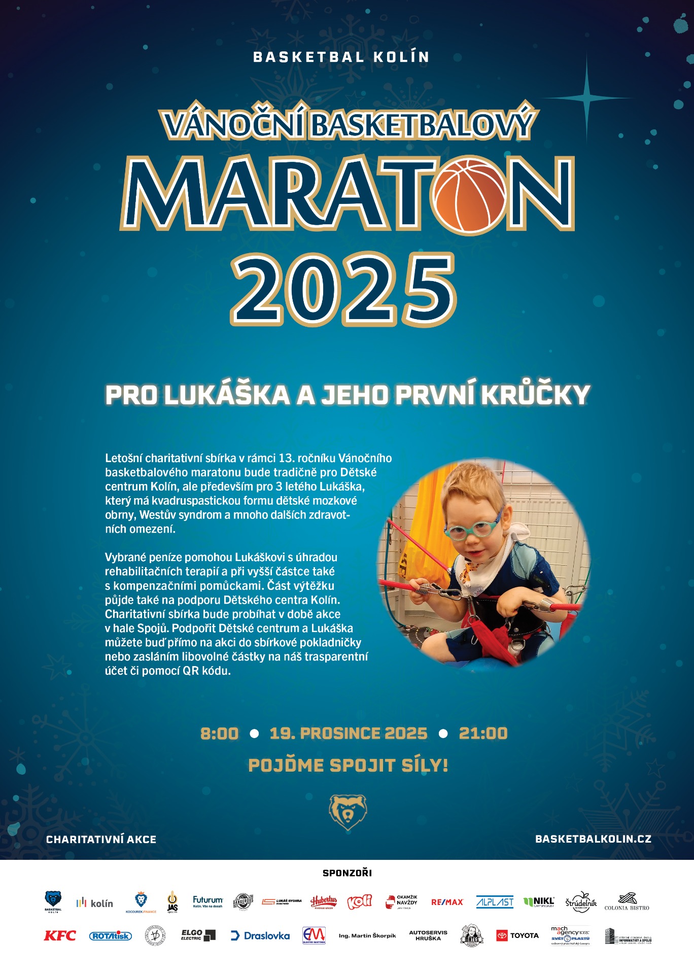 Basketbalový klub Kolín pořádá už 13. ročník tradičního Vánočního basketbalového maratonu a i letos bude akce spojena s charitativní sbírkou. Tentokrát pomůžeme tříletému Lukáškovi, který bojuje s dětskou mozkovou obrnou, Westovým syndromem a dalšími zdravotními omezeními. Cílem je umožnit mu absolvovat intenzivní rehabilitace a podpořit jeho první samostatné krůčky.