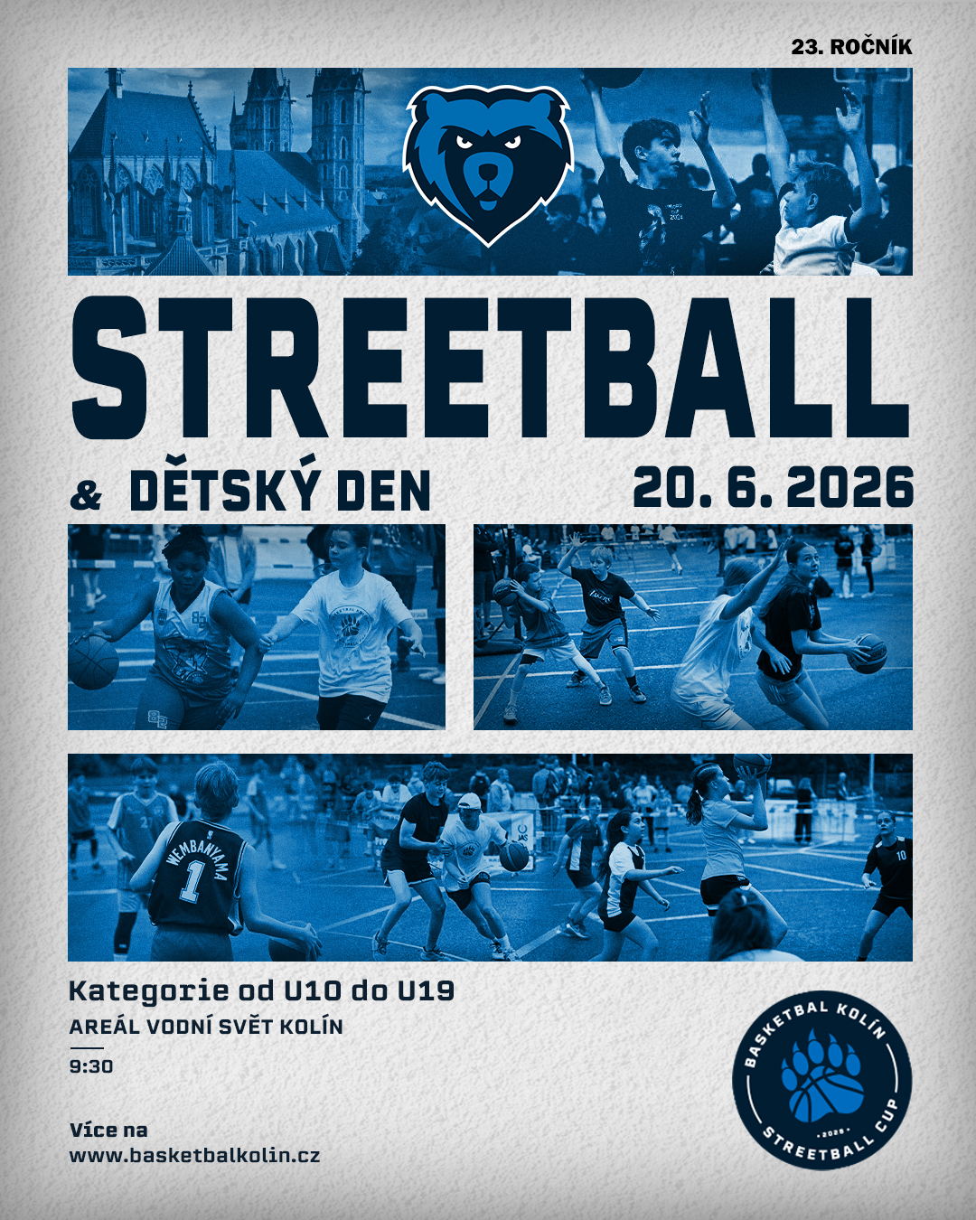Basketbalový klub Kolín srdečně zve všechny hráče, fanoušky i rodiny s dětmi na 23. ročník tradičního turnaje Streetball Cup, který se uskuteční v sobotu 20. června 2026 v areálu Vodní svět Kolín. Akce začne v 9:30 a po celý den nabídne sport, zábavu i skvělou letní atmosféru pro malé i velké návštěvníky.